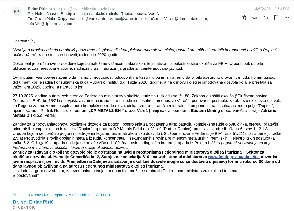 obraćamo vam se s molbom da nam razjasnite nelogičnost vezanu za sekciju Mjere za zaštitu zraka iz dokumenta "Studija o procjeni uticaja na okoliš podzemne eksploatacije kompleksne rude olova, cinka, barita i pratećih mineralnih komponenti u ležištu Rupice" općina Vareš (u daljem tekstu: Studija), koji je vaša kompanija 2020. godine izradila za naručioca tadašnjeg naziva "Eastern Mining" d.o.o. Sarajevo, a danas DPM Metali d.o.o. Vareš.